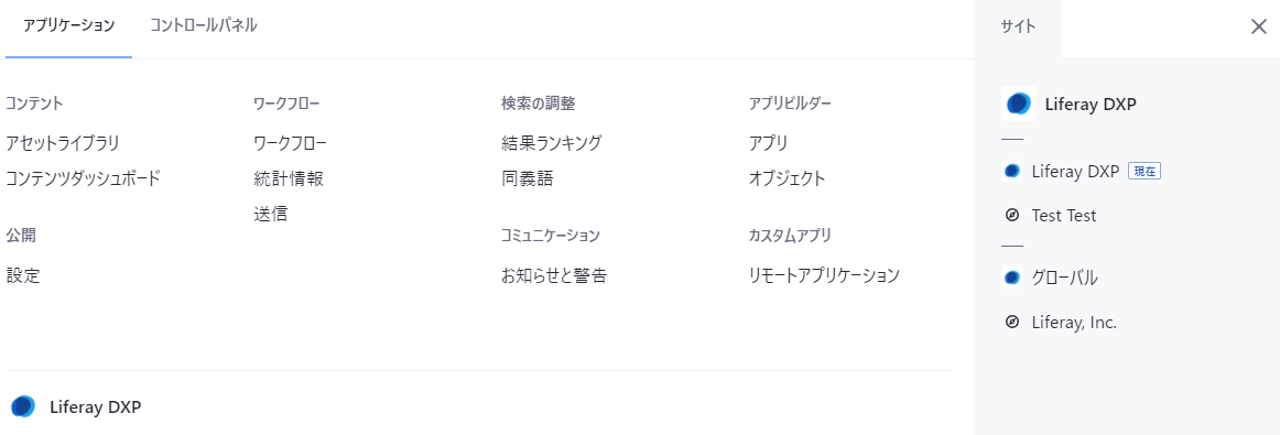 まず、公開機能を有効にします。管理者ユーザでLiferayにログインし、画面右上のグローバルメニューアイコン