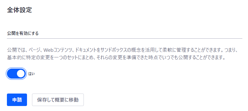 公開設定画面が表示されるので「公開を有効にする」を「はい」に変更して「申請」をクリックします。
