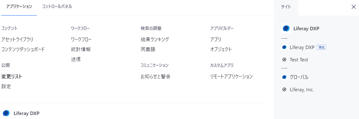 これで公開機能が有効になりました。公開機能が有効になるとグローバルメニューには公開欄に「変更リスト」が表示され、ここから公開を管理できるようになります。なお、Liferayでは公開機能で管理するWebサイトのバージョンのことを「公開」と呼びます(少し紛らわしいです)。