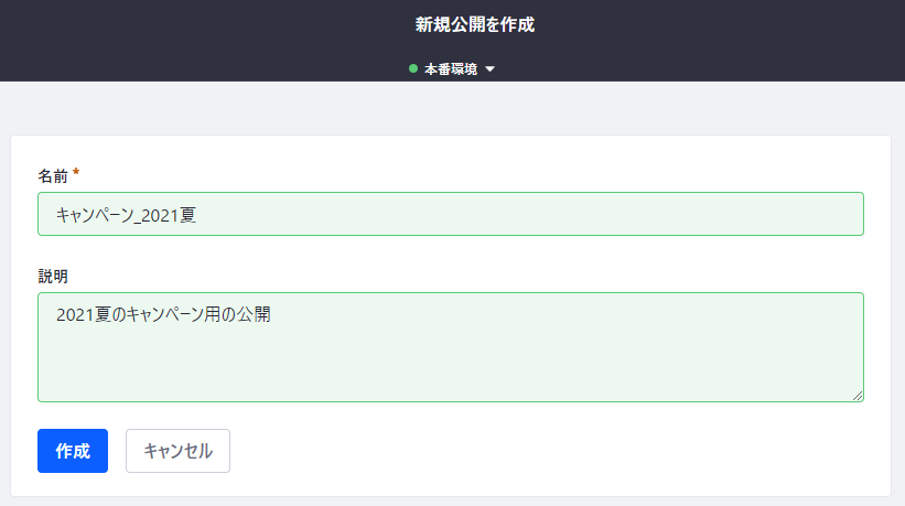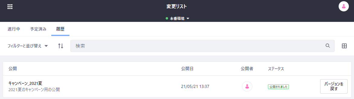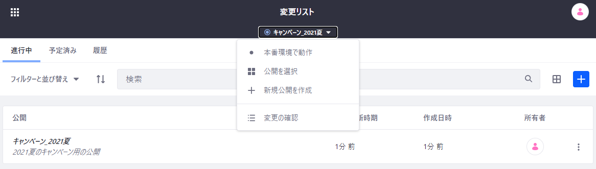 これで新しい公開が追加されました。変更リスト画面上部のドロップダウンで、現在選択されている公開(もしくは本番)を切り替えることができます。