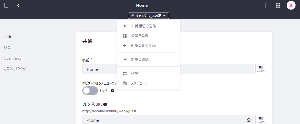 なお、ページ設定画面でも編集している公開の確認や編集対象の公開の切替を行うことができます。