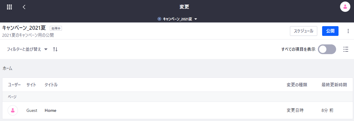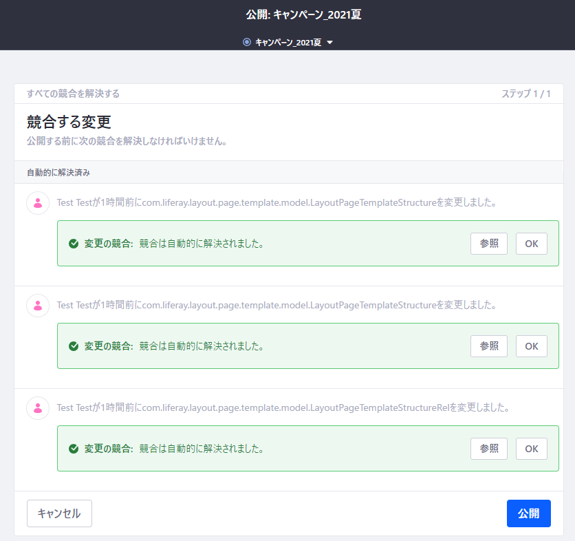 今回は即時公開を試してみるので、「キャンペーン_2021夏」で「公開」をクリックします。すると、公開画面で競合する変更の一覧が表示されるので、必要に応じて処理します。全てが解決したら「公開」をクリックします。(公開の編集作業をしている間に元のサイトやコンテンツをいじっていなくても競合が表示されるようですが、その場合は自動的に解決されるようですので問題ないかと思います)
