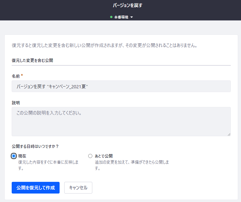 「バージョンを戻す」をクリックすると、その公開の変更を打ち消し、元の表示に戻すような公開が作成されます。それをすぐに公開することもできますし、後ほど公開することもできます。