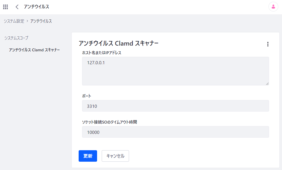 3. 「ホスト名またはIPアドレス」にclamdのサーバのIPアドレス、ポートにclamdのポート番号を入力します。今回はdockerでローカルホストの3310番にclamdを公開しているので以下のようにIPアドレス127.0.0.1、ポート3310番と設定します。これで「更新」ボタンを押せば設定完了です。