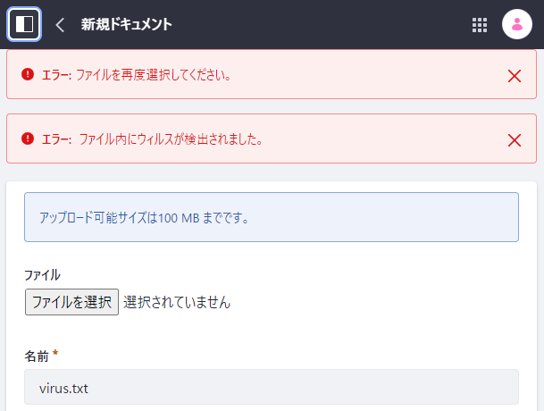 以下のように「ファイル内にウィルスが検出されました。」と表示されてファイルアップロードに失敗すれば、動作確認OKです。