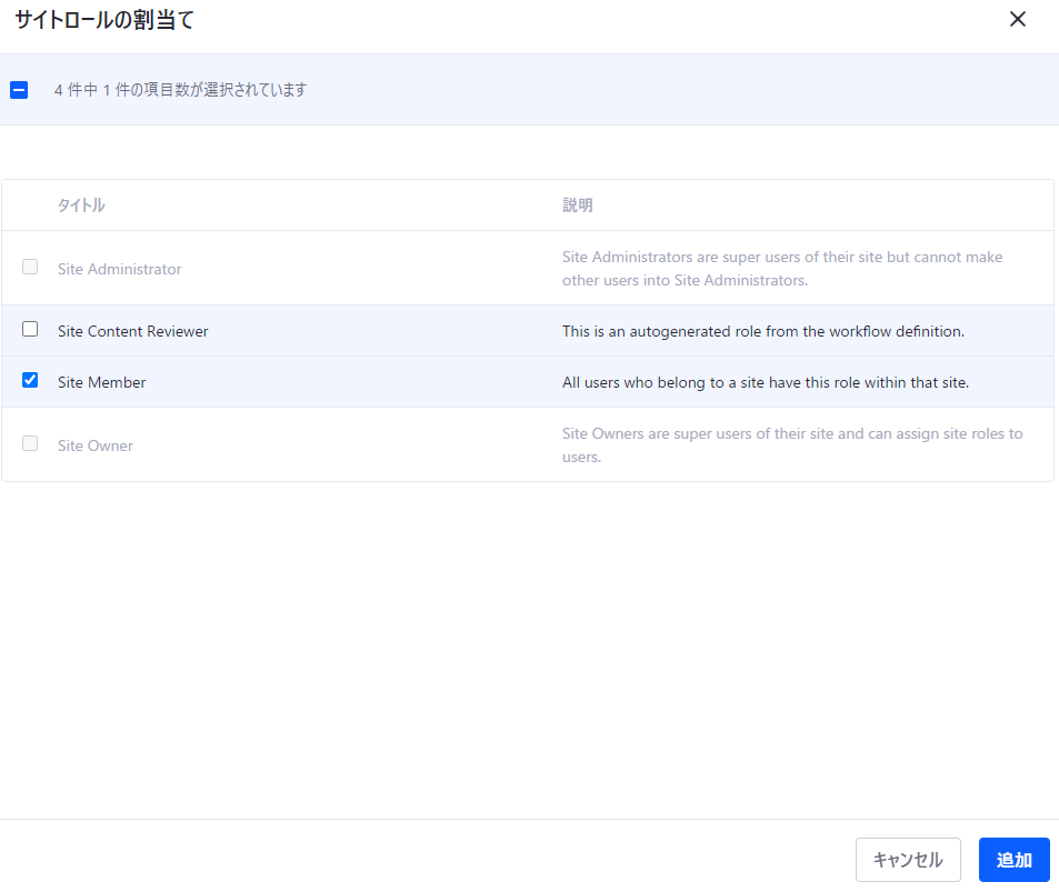 5. Site Memberロールを選択して追加をクリックする。Site Administrator/Site Ownerはアサインできないようになっている
