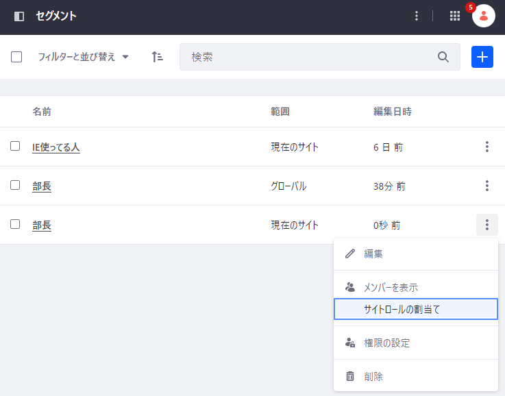 4. セグメントを定義できたら、そのセグメントのアクションメニュー > サイトロールの割当て をクリックする。なお、グローバルサイトのセグメントのアクションメニューにはサイトロール割り当てアクションは表示されない